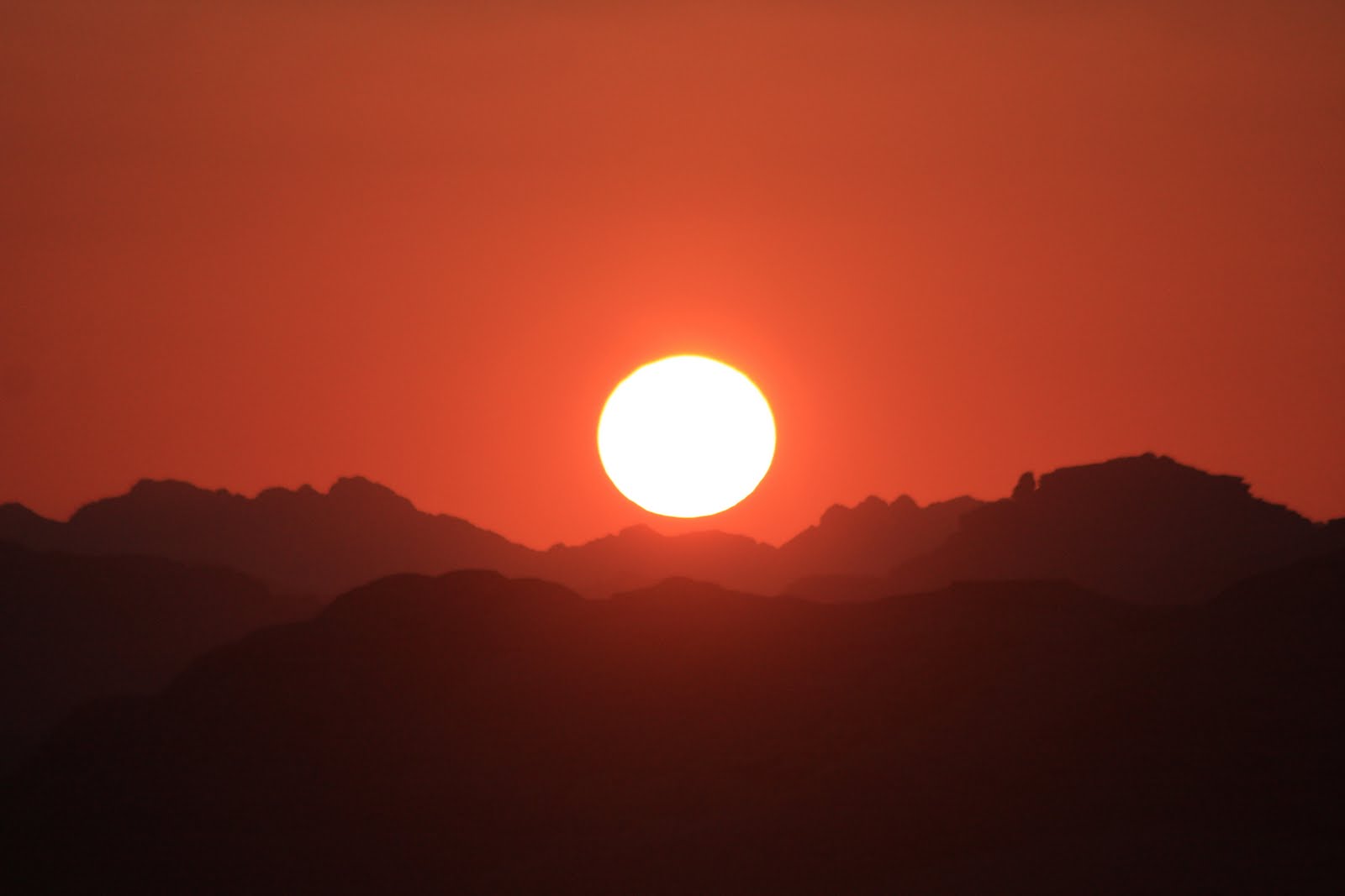 Lasciati i dromedari lui prosegue la strada e noi ammiriamo il tramonto dalle rocce del campo tendato. Il sole scompare dietro i profili seghettati delle montagne in lontananza e subito è freddo. Il cielo è ancora rosso fuoco e man mano si scolora. Andiamo a bere un tè caldo, che oggi servono nella tenda grande con fuoco e beduini che suonano l'oud mentre cantano. Starei qui per sempre, mi sembra che sia tutto quello che serve. I beduini sono molto loquaci ed è sempre interessante scambiare opinioni. Molte persone fanno un giorno solo nel deserto, perciò in tre giorni conosciamo molta gente. La maggior parte dei turisti sono italiani, ma conosciamo anche spagnoli, brasiliani, australiani e olandesi. E' divertente sentire le esperienze di tutti, mentre a piedi nudi sui materassi sorseggiamo il te.